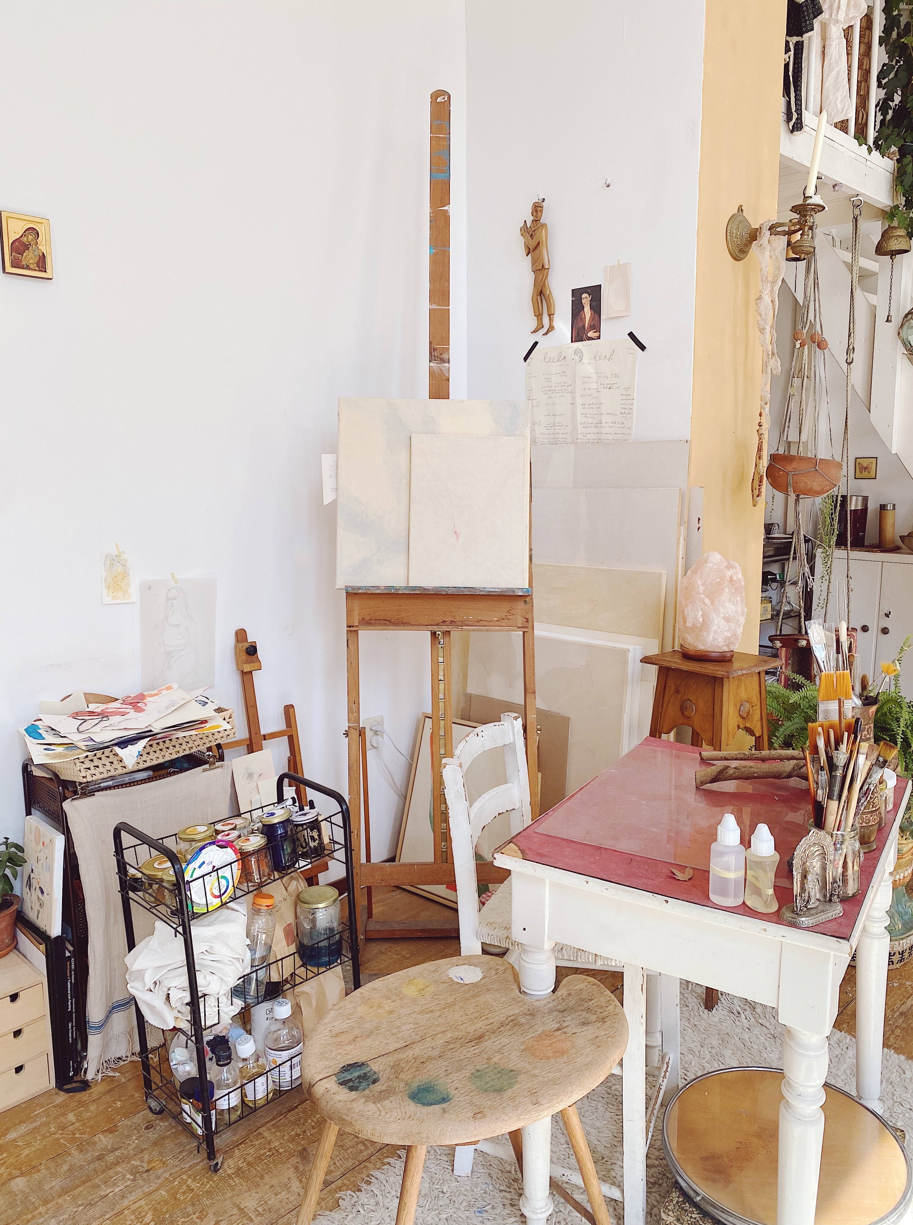 When possible I make my paints from scratch, using natural materials, ancient methods & recipes and my very own hands. Working with primary earth materials reveals its mysterious relationship with our own natures. I get to know matter when I make paint; it is deeply satisfying to feel their textures and qualities, their energy and how they collaborate. I do use synthetic, modern pigments in case the ancient ones involve animal harm, like sepia or carmine.