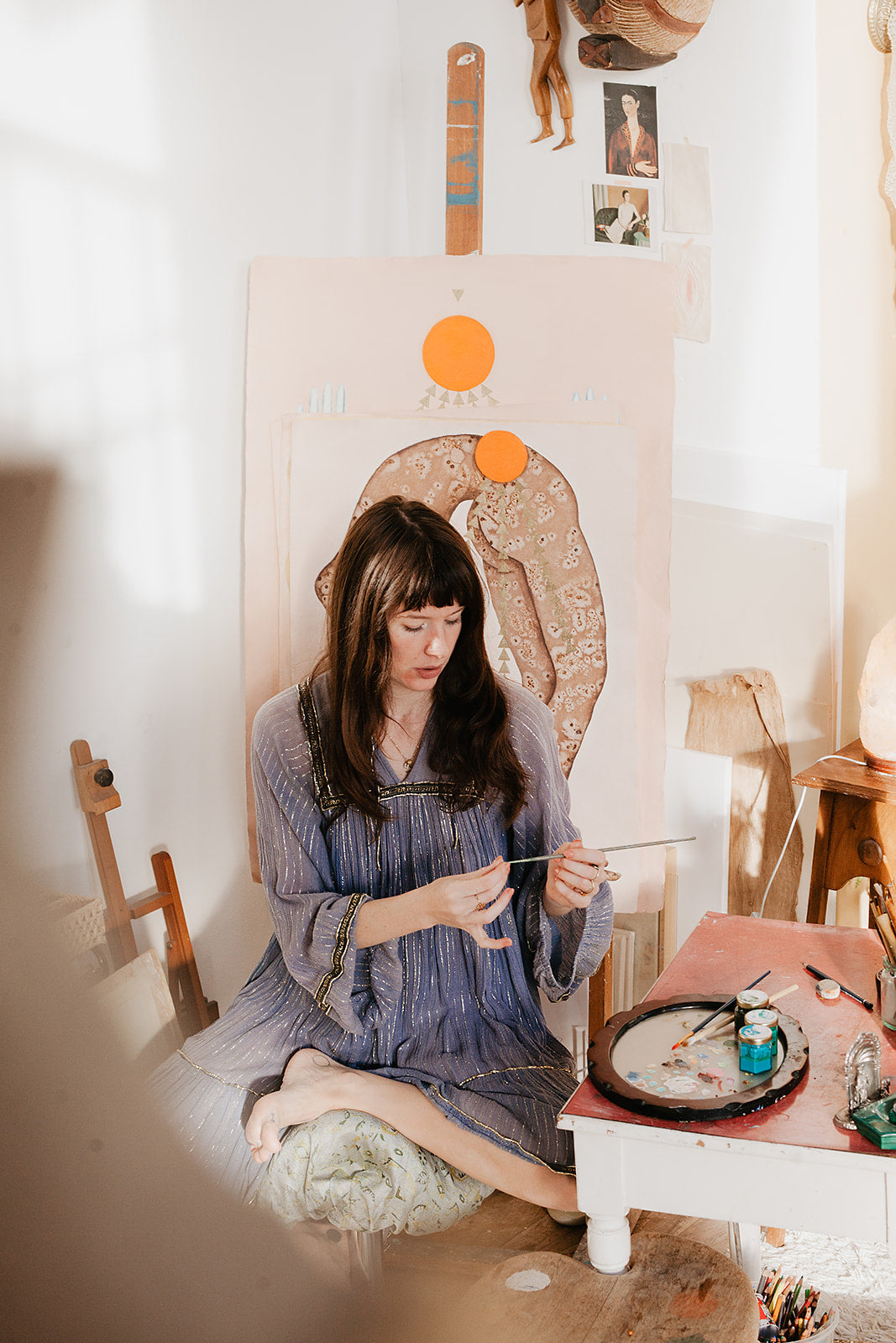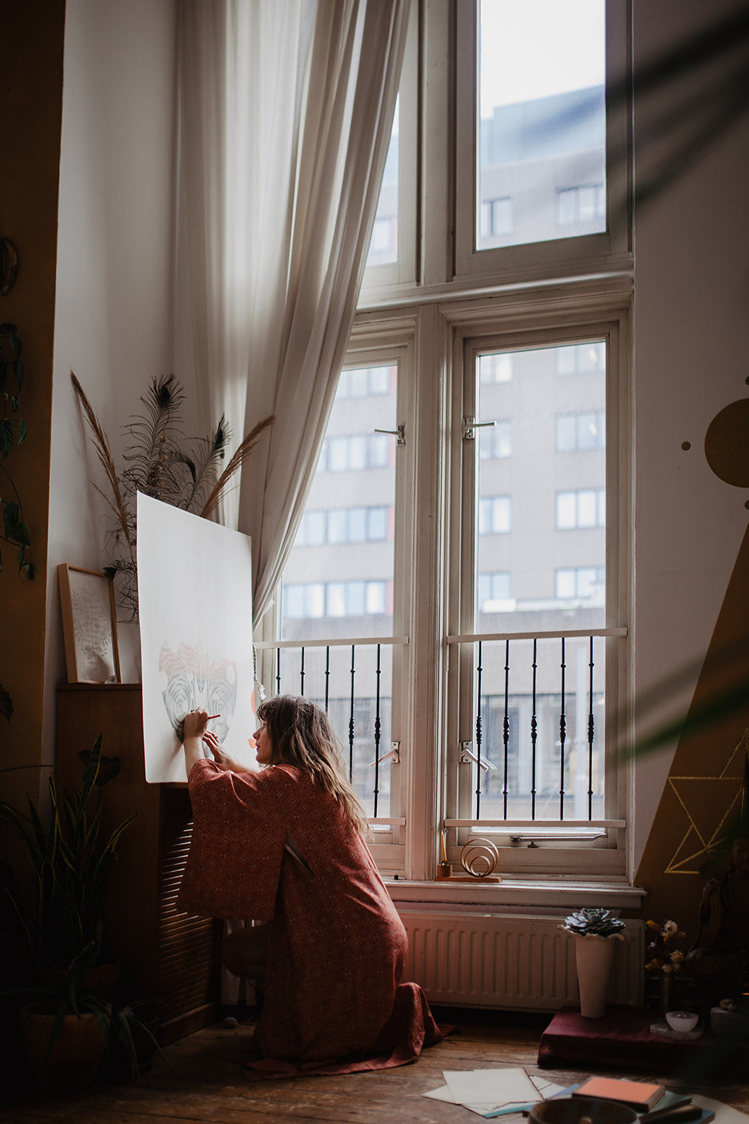 The proces of gathering and making materials is as much part of the artwork as the end result itself, an alchemy of energies and intentions of all who are involved - the plants and trees who give their matter, the moods of people handling them and thoughts of they who transport. The attention, care and love I transmit. The vibrations of the sacred oils mixed into the paints, the frequencies of gold and the space where the work is created. The alchemy of the elements and ingredients. My intuition and guidance from the subtle realms and dreamtime. The symbols, hidden codes and shapes weaved into an image. They all merge into a piece of art. And they all merge with your field, feelings and subconscious, touching your soul and moving the spirit.