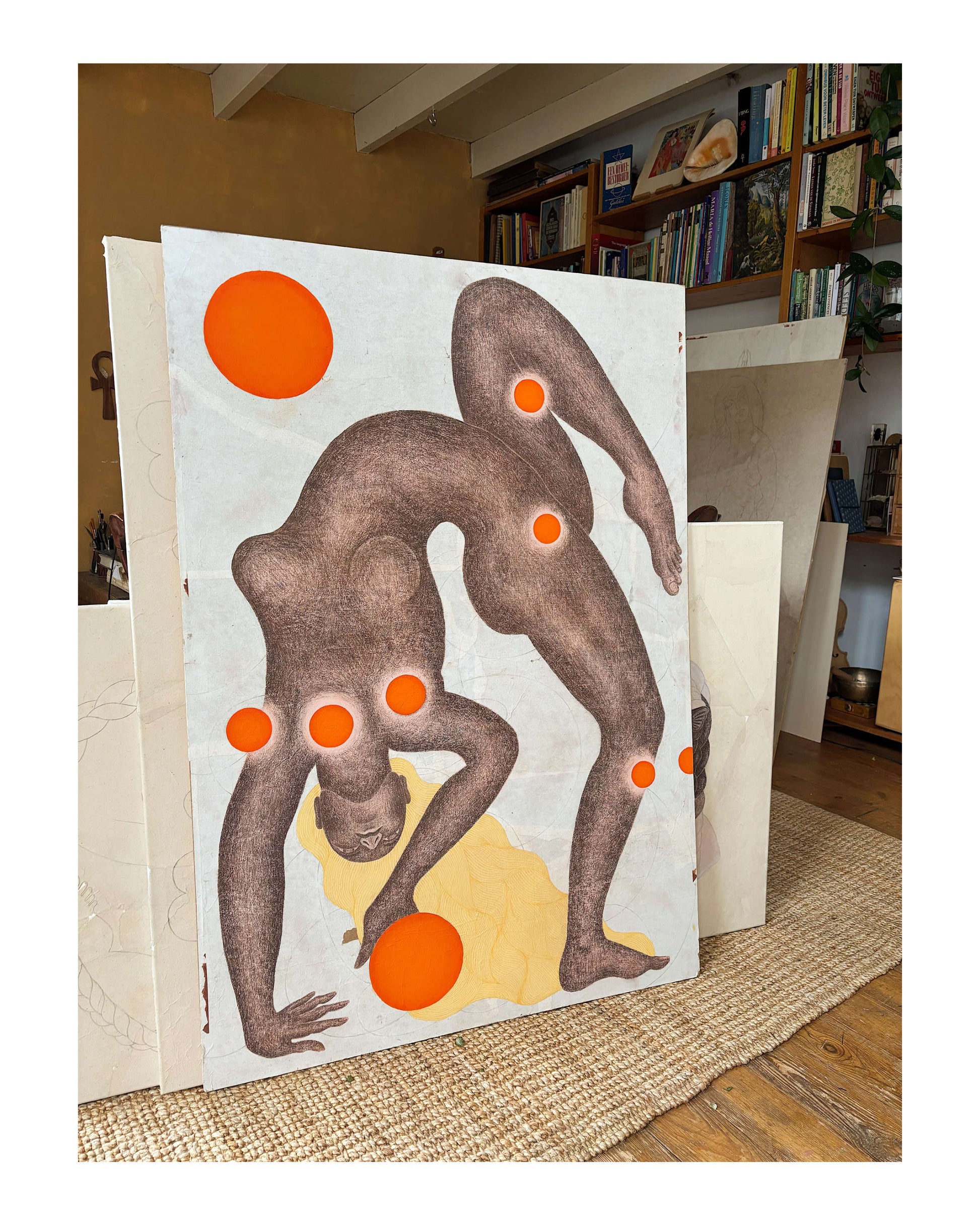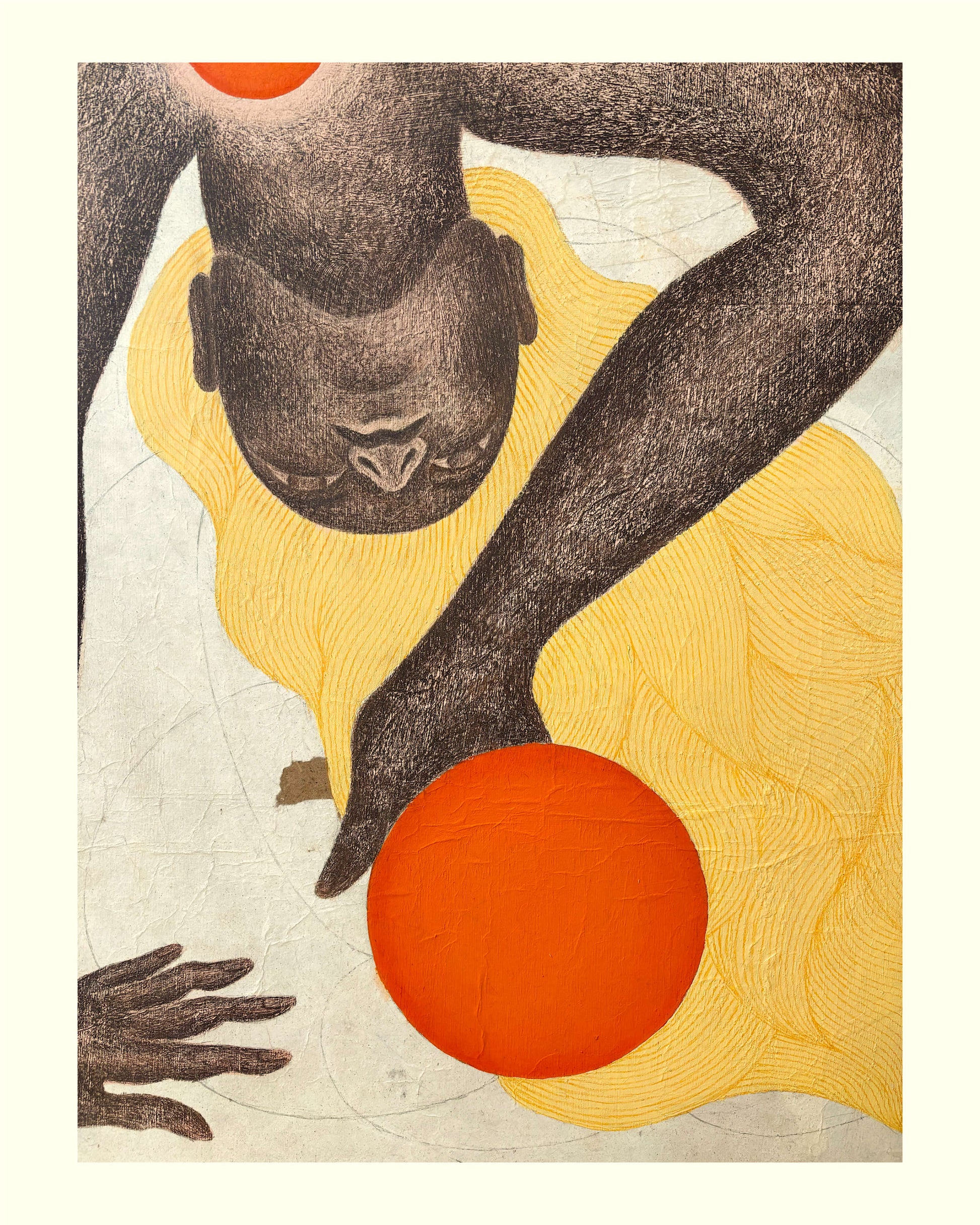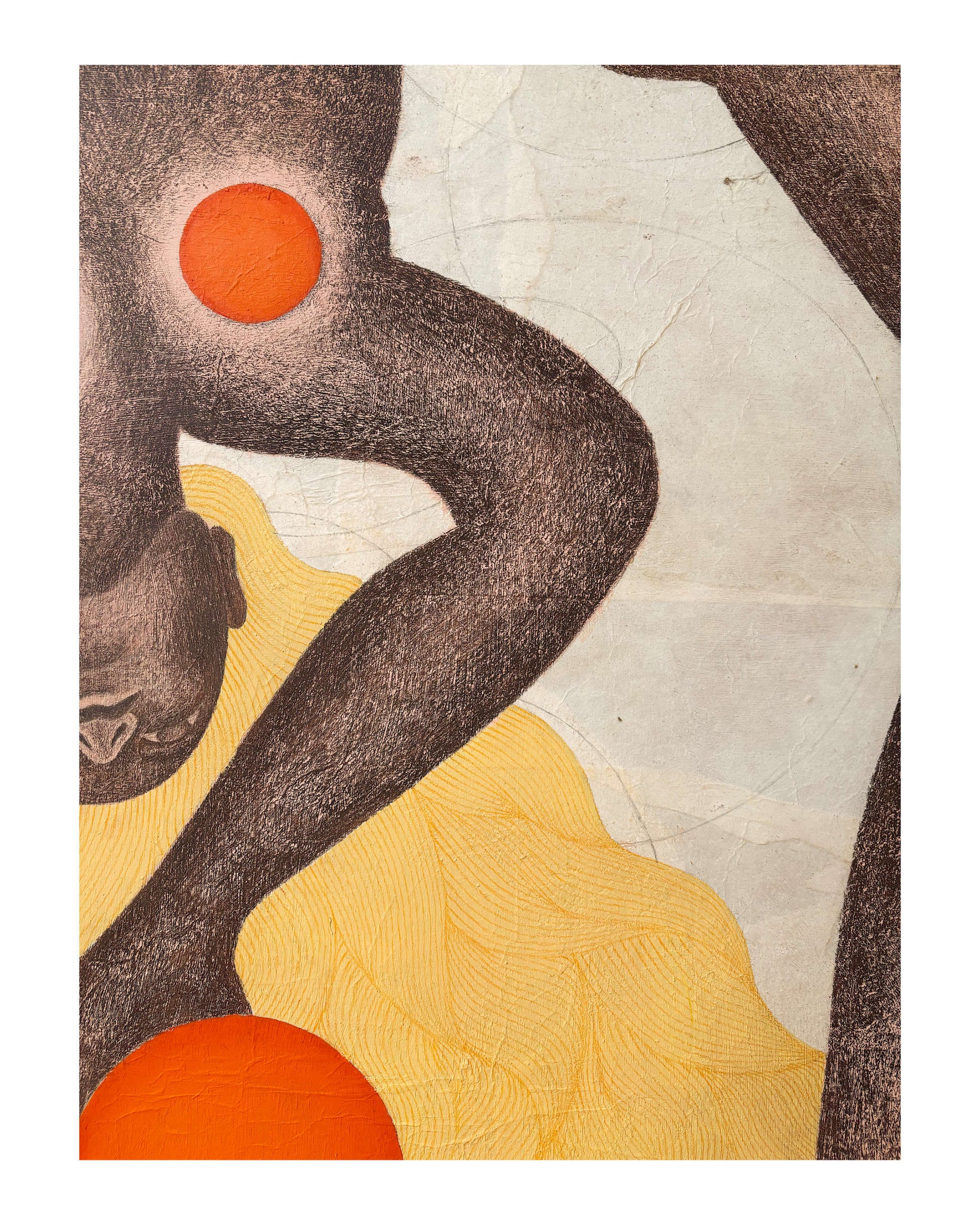 coloured pencil, acrylics, oil paint on vintage kimono wrapping paper mounted on board