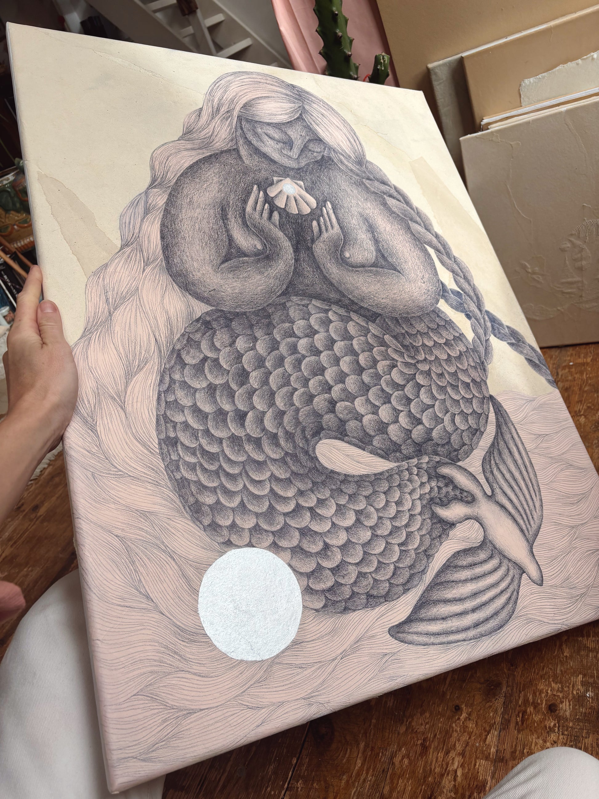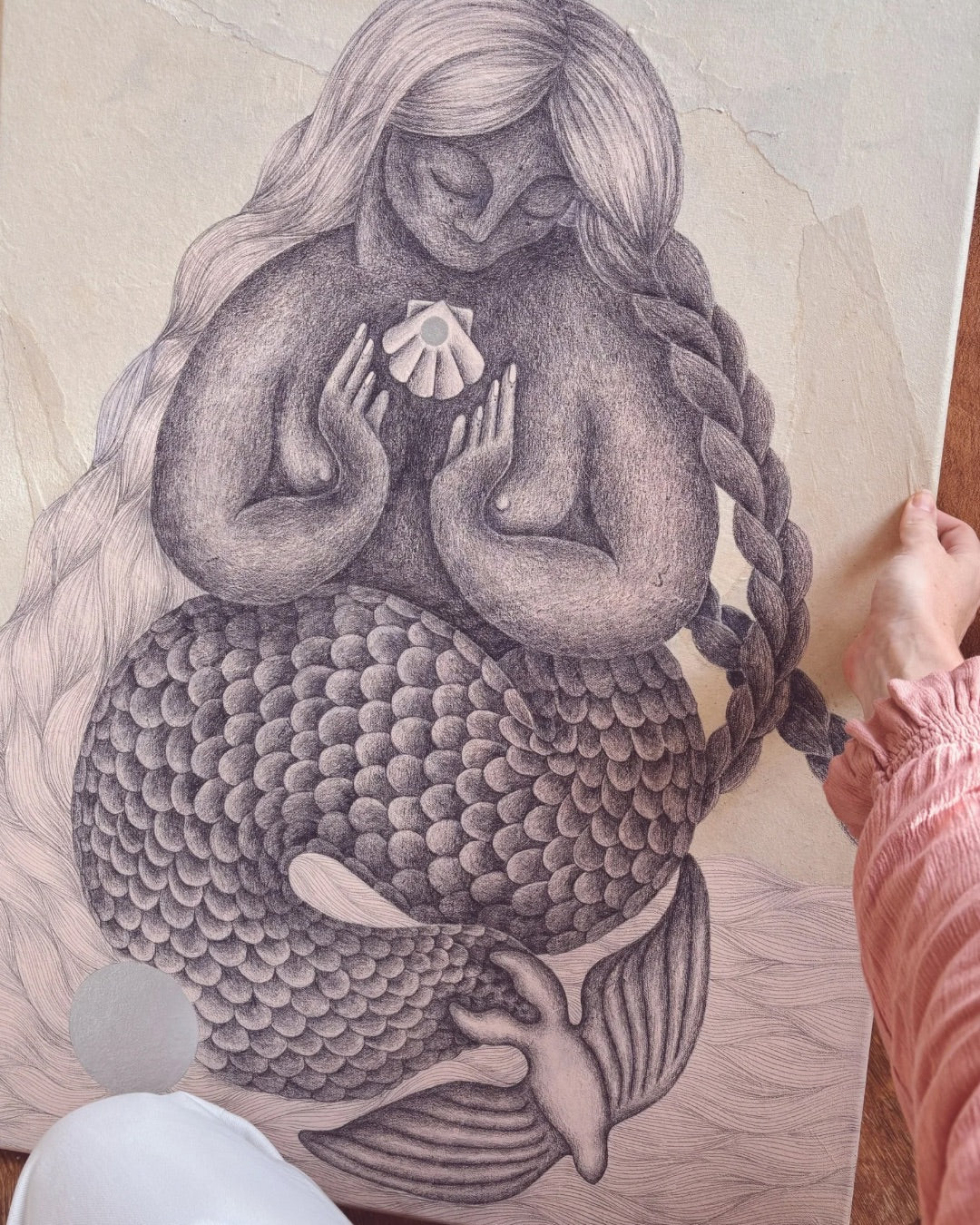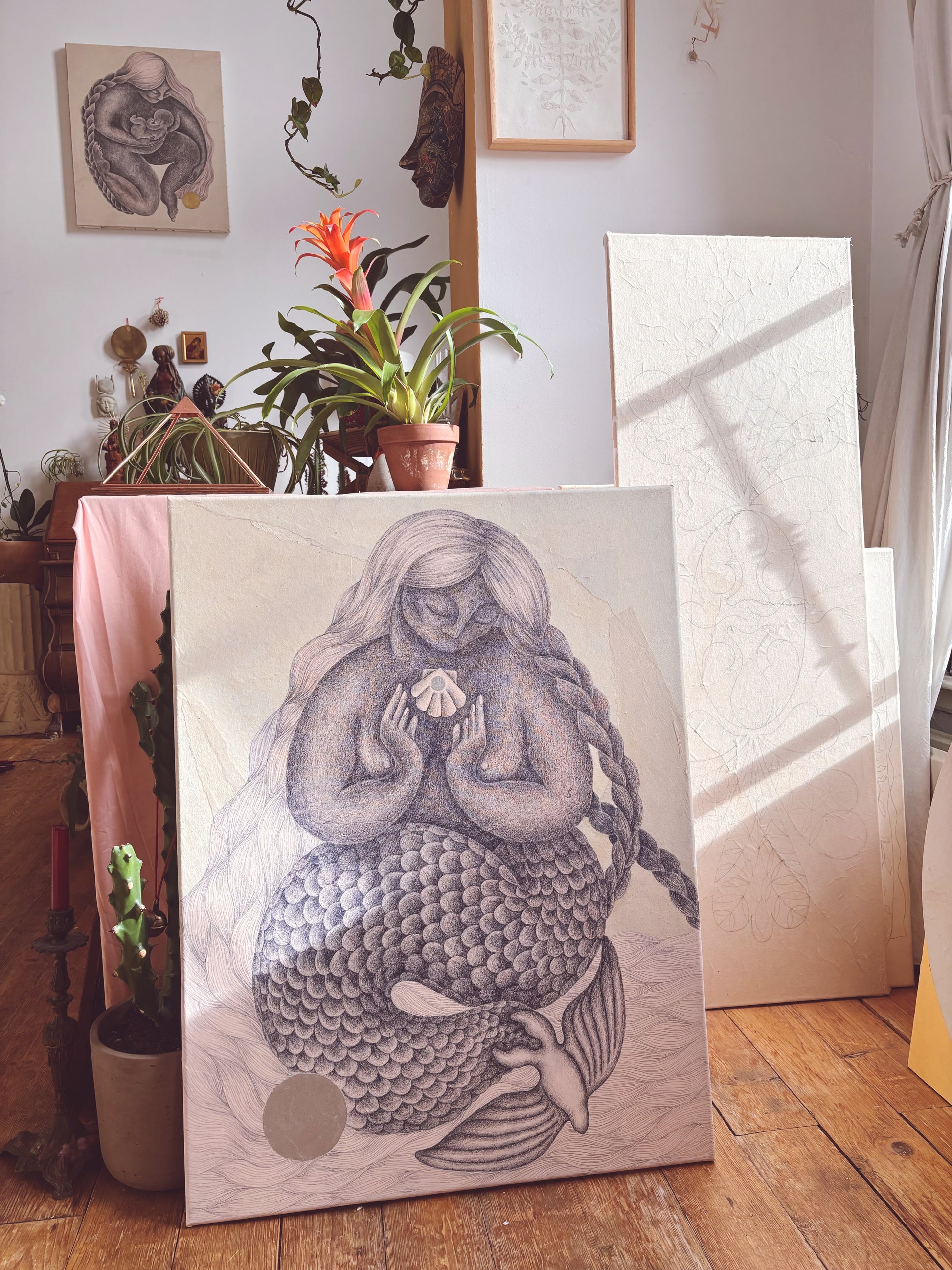 remembering the mermaids - these water entities were among the first beings inhabiting the earth - you see them appear in many myths, stories and folklore of cultures all around the world. 'Seewiif' is the Frisian variety of the mermaid, and connected to my roots in the Northern low lands.
