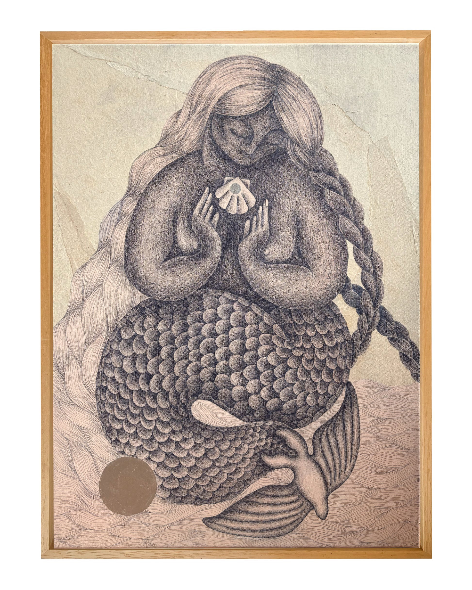 coloured pencil, acrylics, silver pigment on vintage paper mounted on canvas
