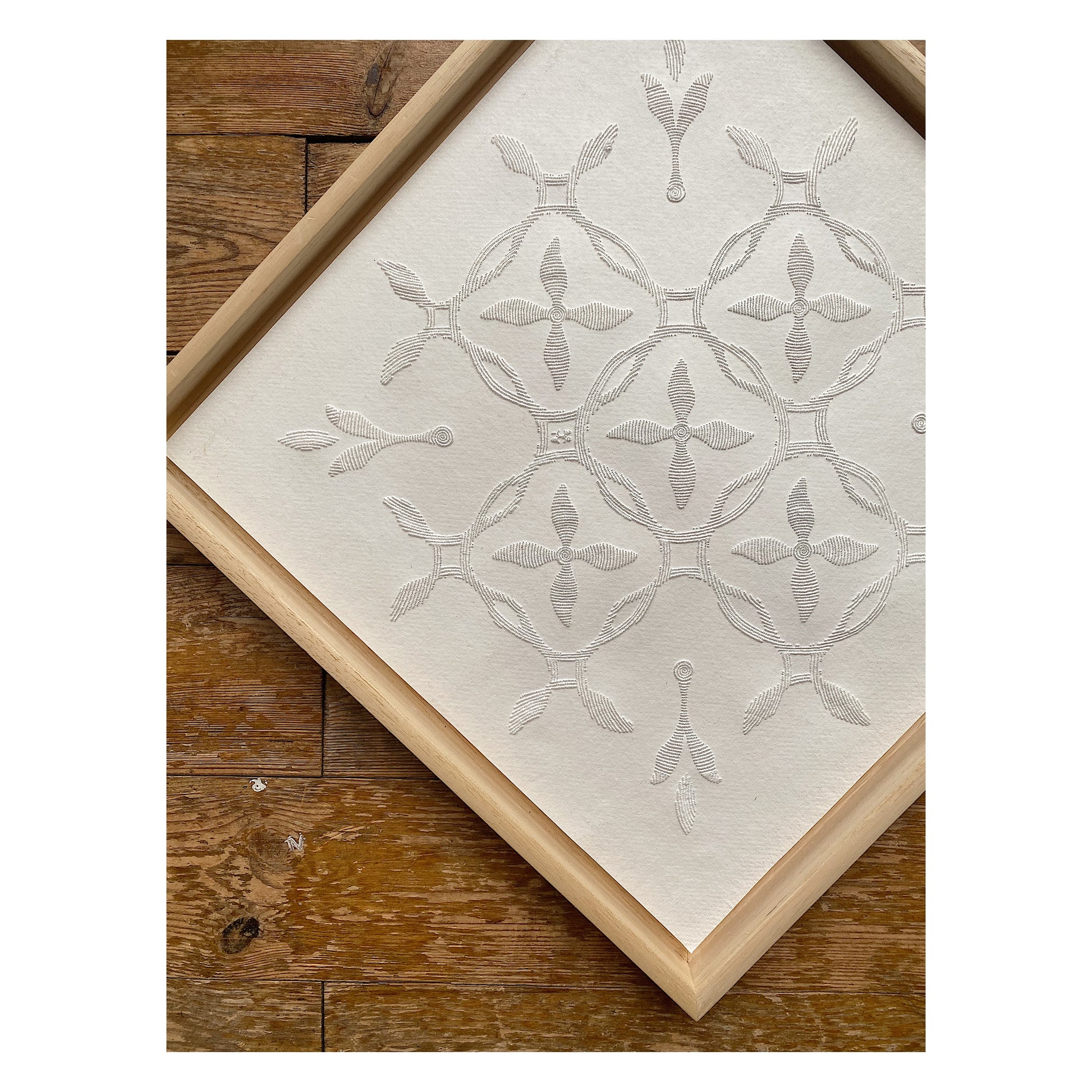 a blind-embossment (also known as debossing) is the process of pressing a design or pattern into the surface of paper or cardstock without adding any ink or foil. The result is a raised, tactile image that can be seen and felt. A delicate, subtle relief in paper, made in my studio with a heavy etch press.